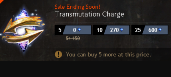 You can get 5 Transmutation Charges for around 150, 25 for around 600, and 10 for around 270. Their purpose is to change the appearance of one gear to another gear.