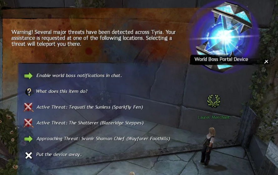 You won’t have to worry about finding the World Bosses yourself, travel to them, and wait for the fight to occur. Rather, you can use the World Boss Portal Device from the Gemstore to instantly take on the fight and transport to them.